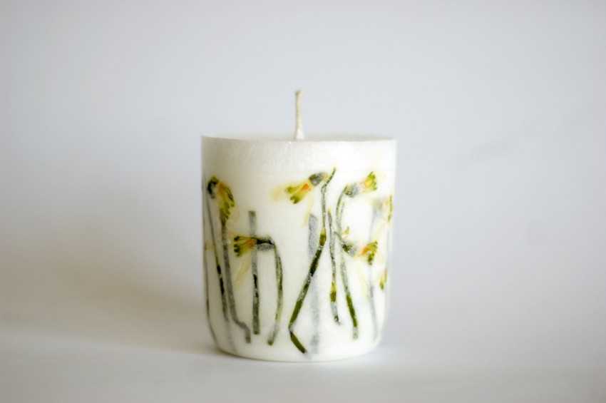 Совсем не обязательно изучать сложные приемы, как сделать восковую свечу, чтобы получить красивый элемент декора. Даже простую цилиндрическую свечку можно украсить уже после её полного остывания, например, перенести на поверхность понравившееся фото. Картинку распечатываем на кальке. Кальку оборачиваем вокруг свечи, а затем фиксируем с помощью вощеной бумаги. Такую бумагу разогреваем феном, пока изображение на кальке не проявится четко на поверхности. После такой «перебивки» вощеную бумагу аккуратно убираем со свечи, на которой остался понравившийся рисунок.