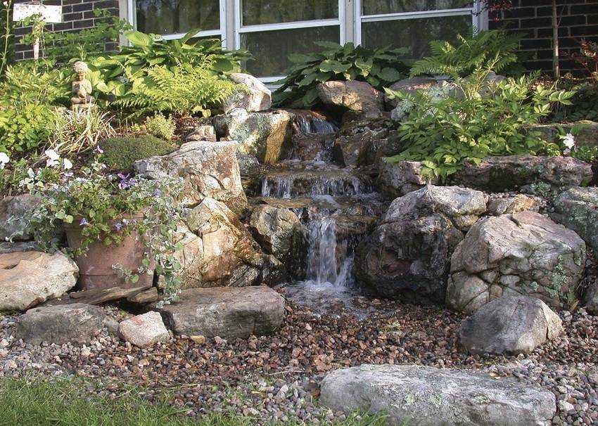 Для сооружения уступов подходят как природные, так и искусственные материалы. Если водопад впадает в пруд с валунами и плитами песчаника, необходимо выбрать для дизайна такие же камни.