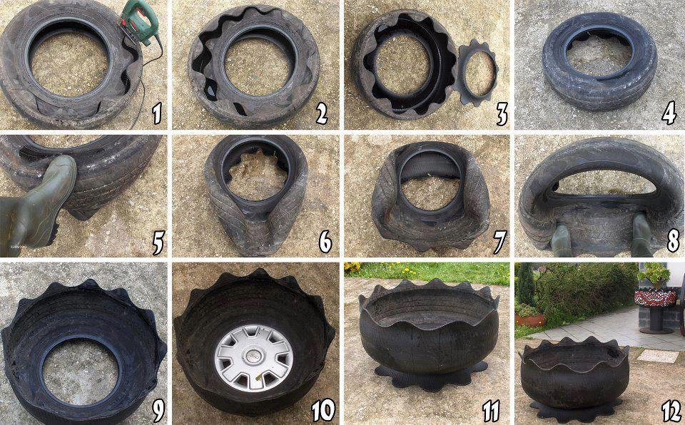 - из старых автомобильных покрышек, разрезанных на длинные ленты, которыми переплетают металлические колышки;