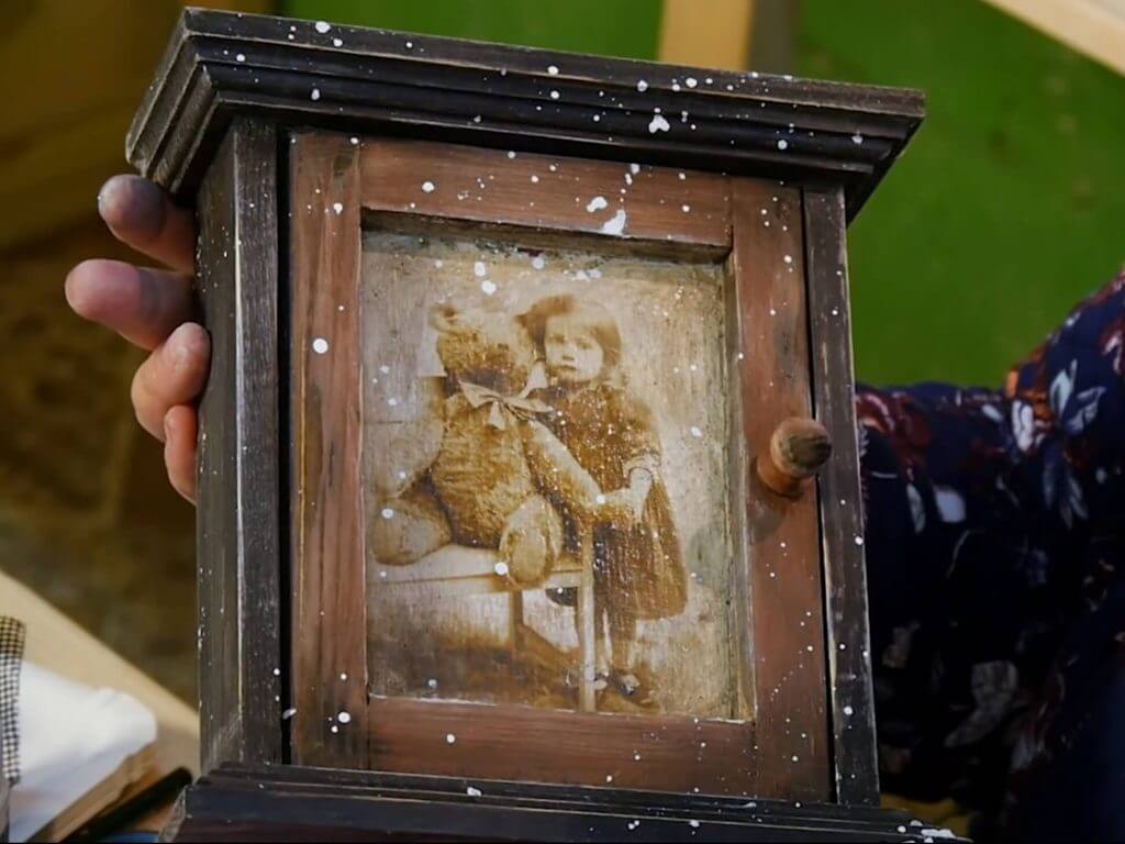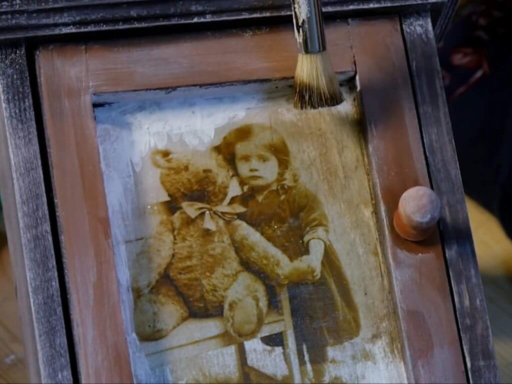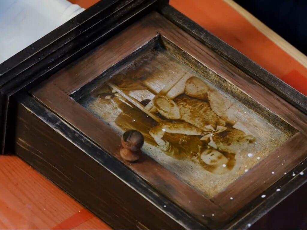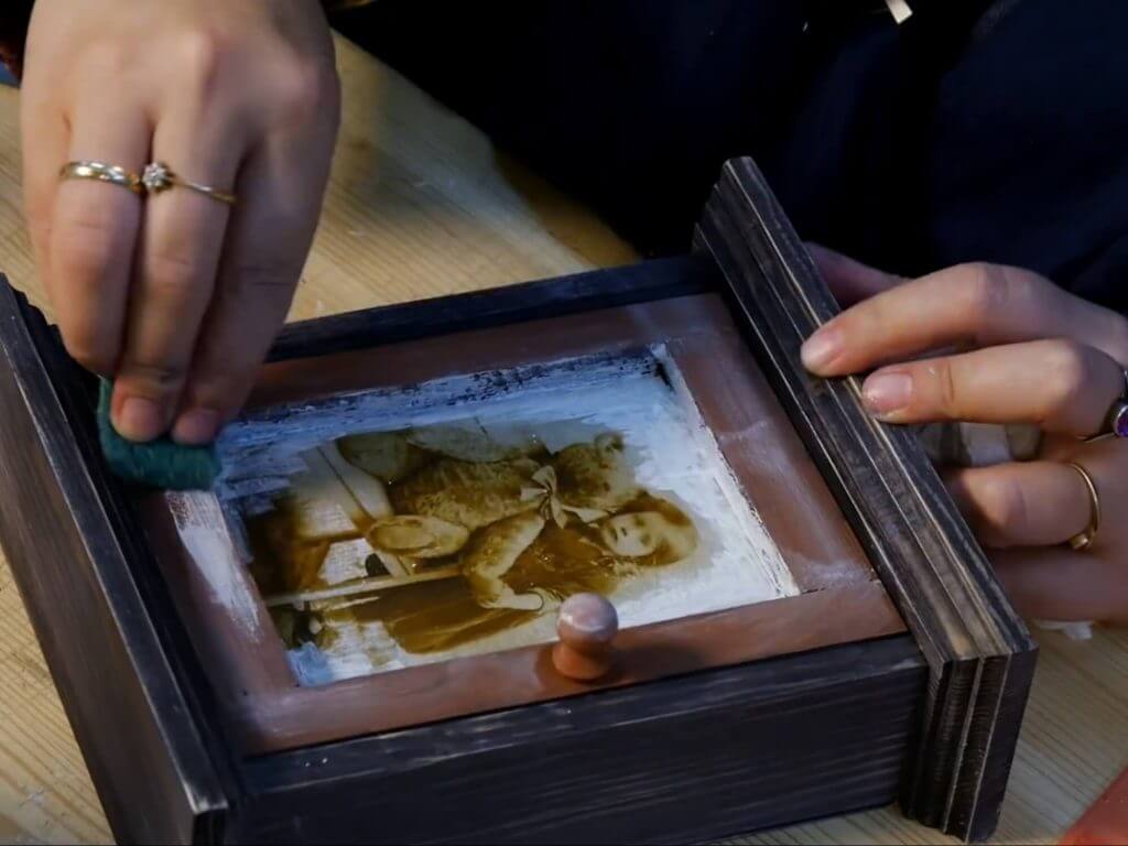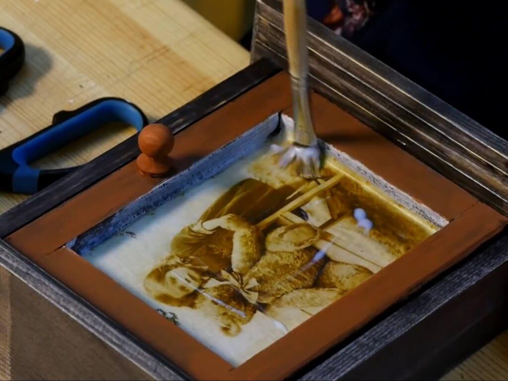 Далее, наносим патину вокруг картинки, капнув каплю патины на бумагу и обмакнув кисть, украшаем нашу картинку налётом старины. Пройдёмся патиной по всей поверхности изделия, особенно в углах. У нас получается состаренное фото. Можно в конце добавить цветного лака. Подсушим работу феном. Затем наждачкой потрём по открытым местам.
