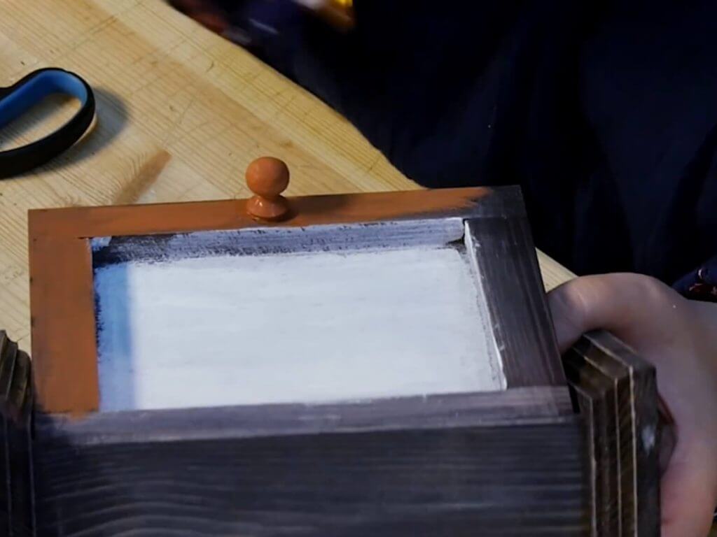 Можно пройти сухой кистью по бортикам и поверхности. Затем займёмся обработкой выступающей части (рамки). Капаем на одноразовую тарелку коричневой акриловой краски. Наносим на рамку тонкой кистью. Получается коричневая рамочка. Подсушиваем феном.