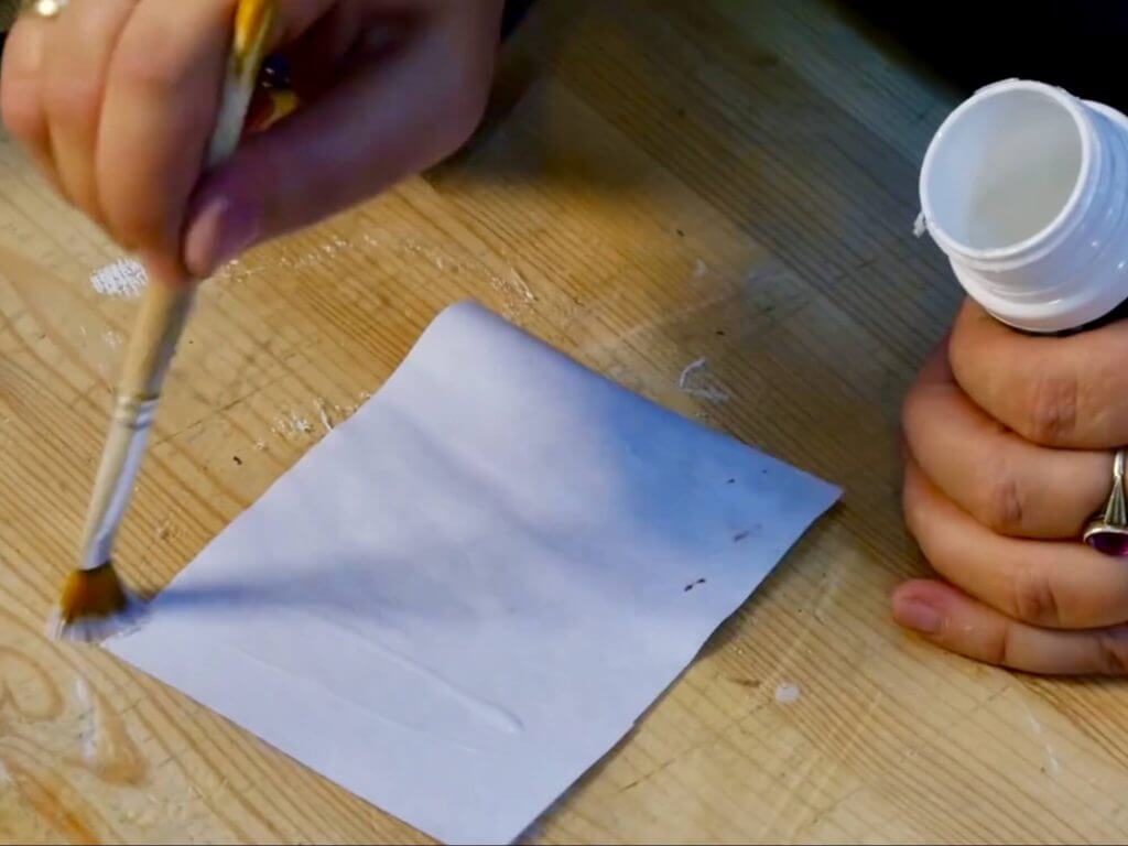 Далее, берём клей ПВА (обычный клей ПВА разводят с водой в соотношении 2:1) или клей-лак, наносим на рисунок и поверхность.