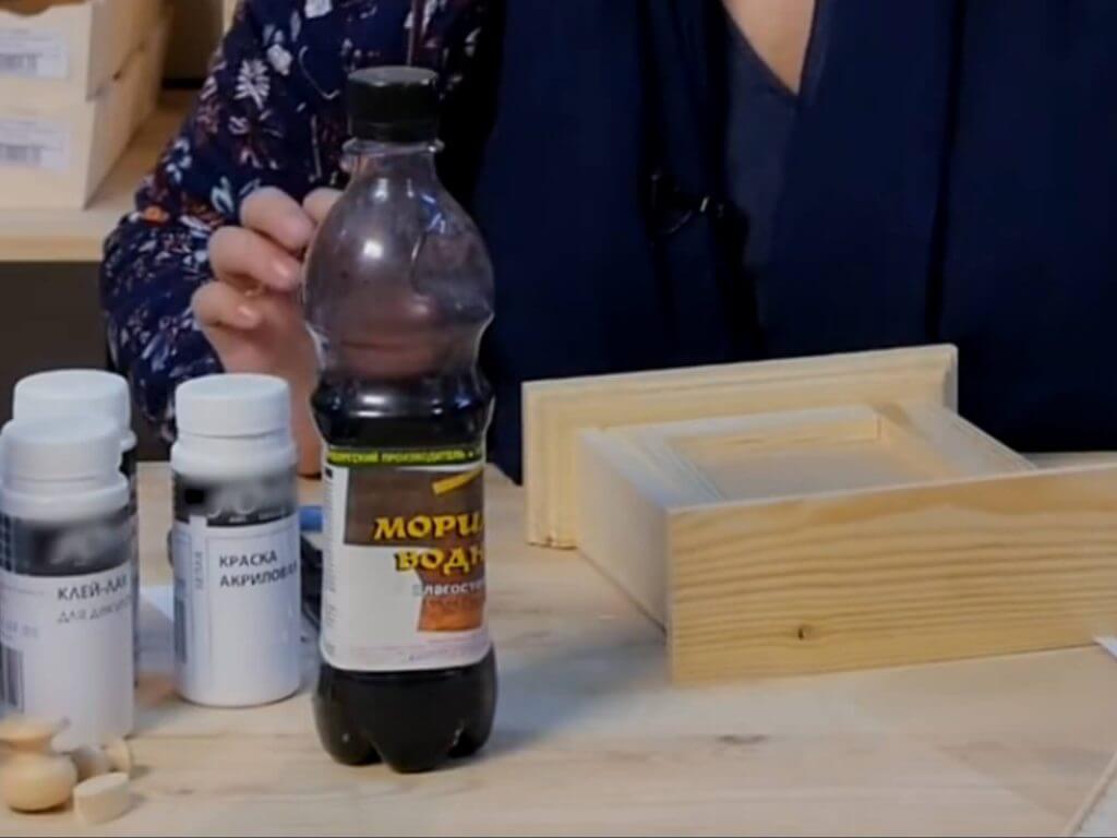 Берём одноразовый стаканчик, морилку и широкую кисть, начинаем покрывать тёмной морилкой всю поверхность. Начать лучше с центральной части ключницы – дверцы. Для чего нам нужна морилка – для того, чтобы внести цвет в древесину, выявить структуру дерева.