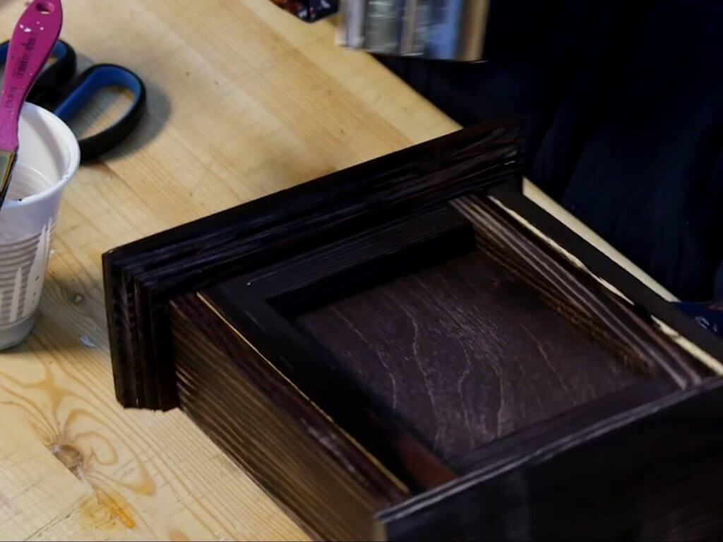 После того, как все детали отпилены под нужный размер, дощечки нужно ошкурить сначала грубой, а потом мелкой шкуркой до гладкости. После этого приступаем к декоративной обработке дерева. Если мы хотим оставить естественную структуру древесины, то можно покрыть доски морилкой, которая придаст дереву благородный оттенок или обжечь доски газовой горелкой — это проявит текстуру дерева, сделает ее более яркой. Окончательная обработка заключается в покрытии всех деталей несколькими слоями лака.