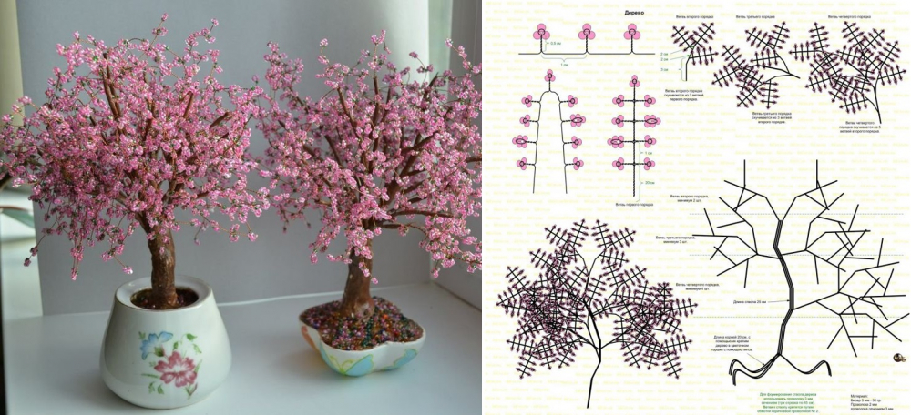 Далее рассмотрим, как сплести из бисера дерево сакура. Для изготовления дерева сакура потребуются такие материалы, как бисер разных цветов (светлый оттенок розового и темнее), проволока, скотч, клей, алебастр, краски, фольга.