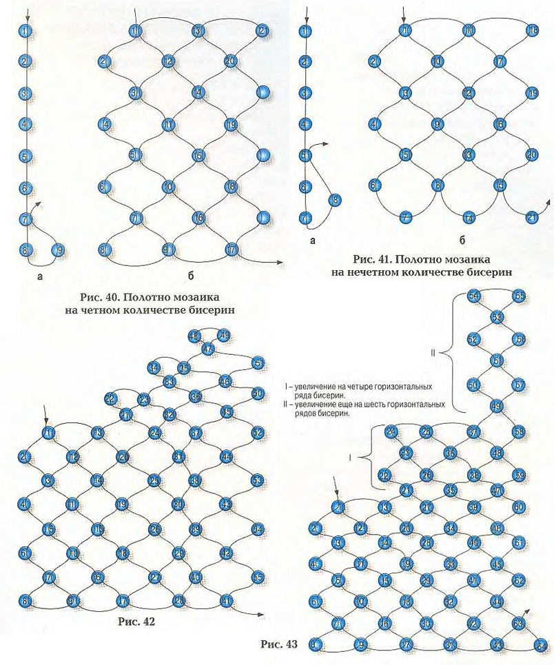 Для плетения четного набирается четное количество бусин, они составляют первый ряд полотна, для второго набираем одну бусину, а иглу пропускаем через вторую бусину от конца ряда, затем прошиваем бусину через четвертую от конца ряда и так далее. Заканчиваем ряд пропусканием иглы через первую нанизанную бусину. Для набора последующих рядов прошиваем бусину через последнюю, нанизанную в предыдущем ряду. Перед тем, как оборвем нить, пропускаем иглу зигзагом через все плетение.