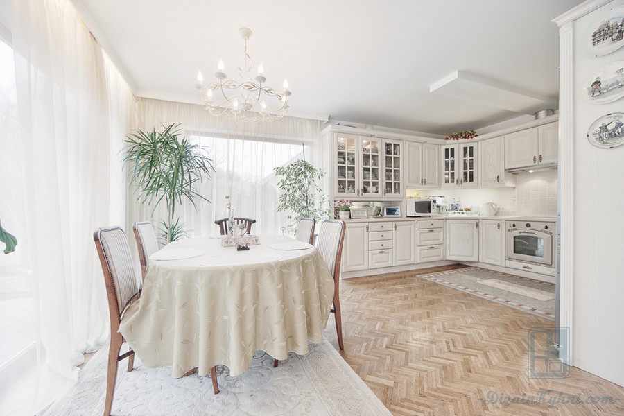 Классическая кухня в светлых тонах — самый распространенный вариант оформления подобного интерьера. Чаще всего устанавливаются фасады светлых оттенков, подбирается соответствующий текстиль и мебель. В качестве напольного покрытия используется керамогранит, паркет или керамическая плитка светлых тонов.
