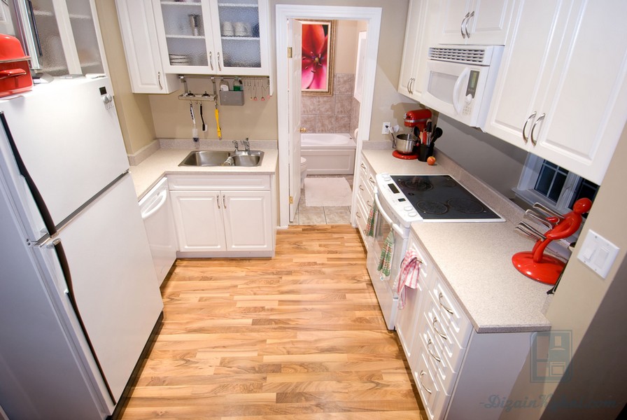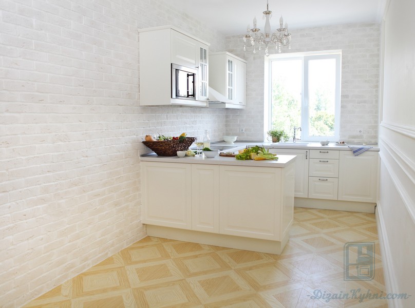 Ламинат — бюджетная альтернатива паркету. Внешне он может имитировать дерево как светлых, так и тёмных пород. Износоустойчивые модели ламината высокого класса не боятся уборки влажной тряпкой, механических повреждений. Дизайн светлой кухни в стиле классика можно увидеть в фотогалерее.