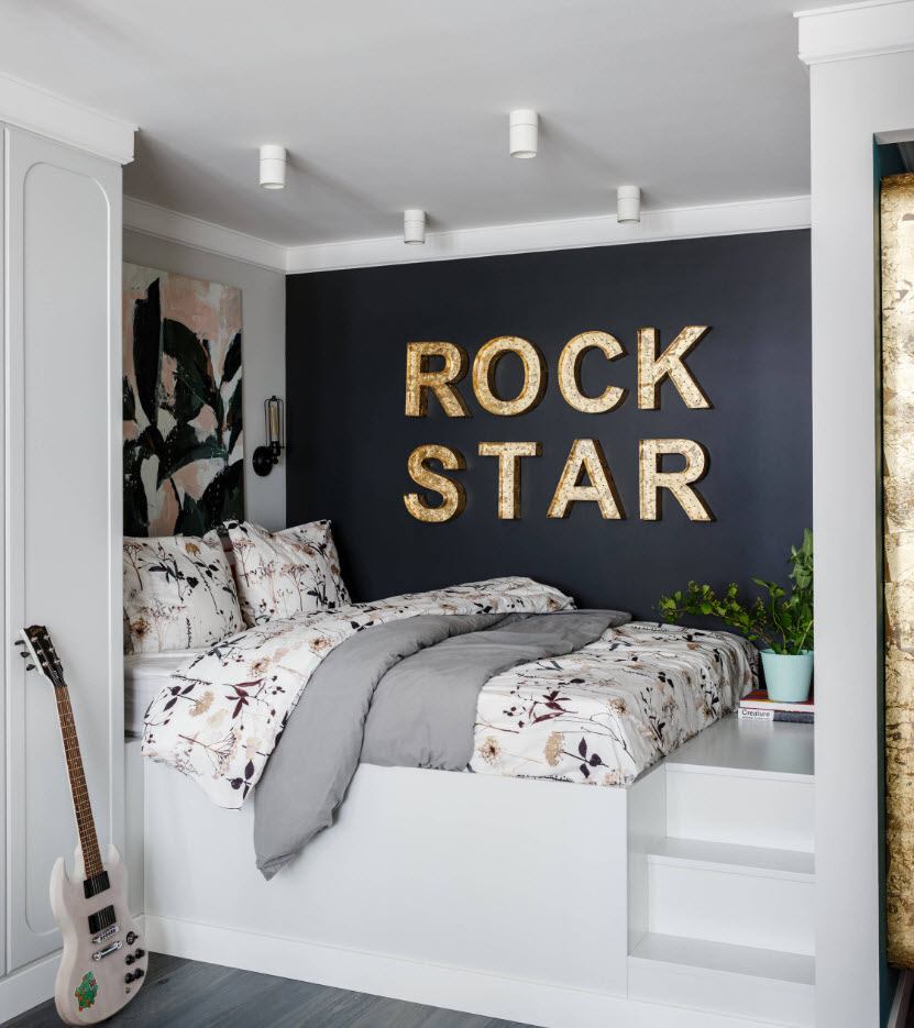 Для самодельного декора можно выделить специальное место и оформить работы в стильные рамки. В спальне тинейджера, увлекающегося музыкальной культурой в стиле рок, помещение возможно стилизовать более профессионально, например, обклеить стены плакатами, сделать на них граффити или разместить гитары.