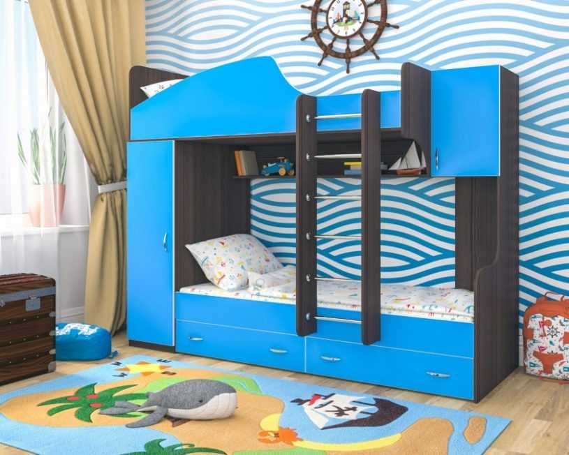 На фото детская для мальчиков и двухъярусная кровать синего цвета, совмещенная со встроенным шкафом.