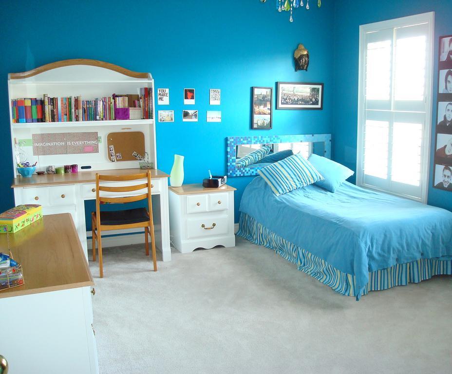 Дизайн комнаты для мальчика с синим интерьером считается классическим вариантом. В первую очередь это связано с тем, что синий является символом мужества, волевого начала и порядка во всем. Синий для спальни хорош тем, что он имеет свойство успокаивать психику, снимать нервное напряжение, что благоприятствует здоровому сну. Но из-за этого же он будет мешать мальчику сосредоточиться во время выполнения домашнего задания и подавлять его настроение. Если же ваш сын изначально не слишком эмоционален, в синей спальне он и вовсе может стать замкнутым. Потому рекомендуется разбавлять синий более светлыми цветами.