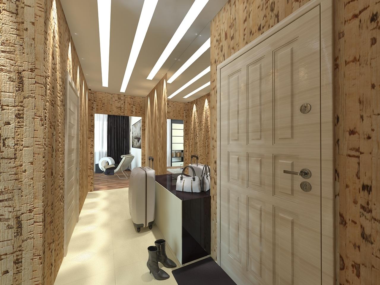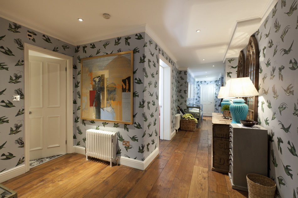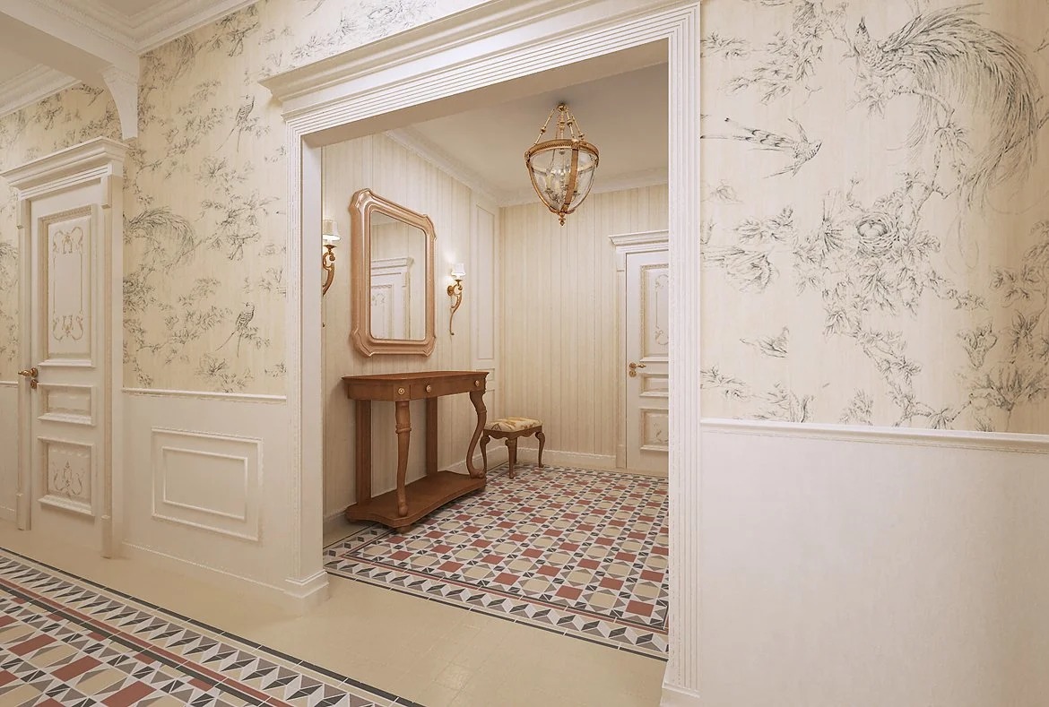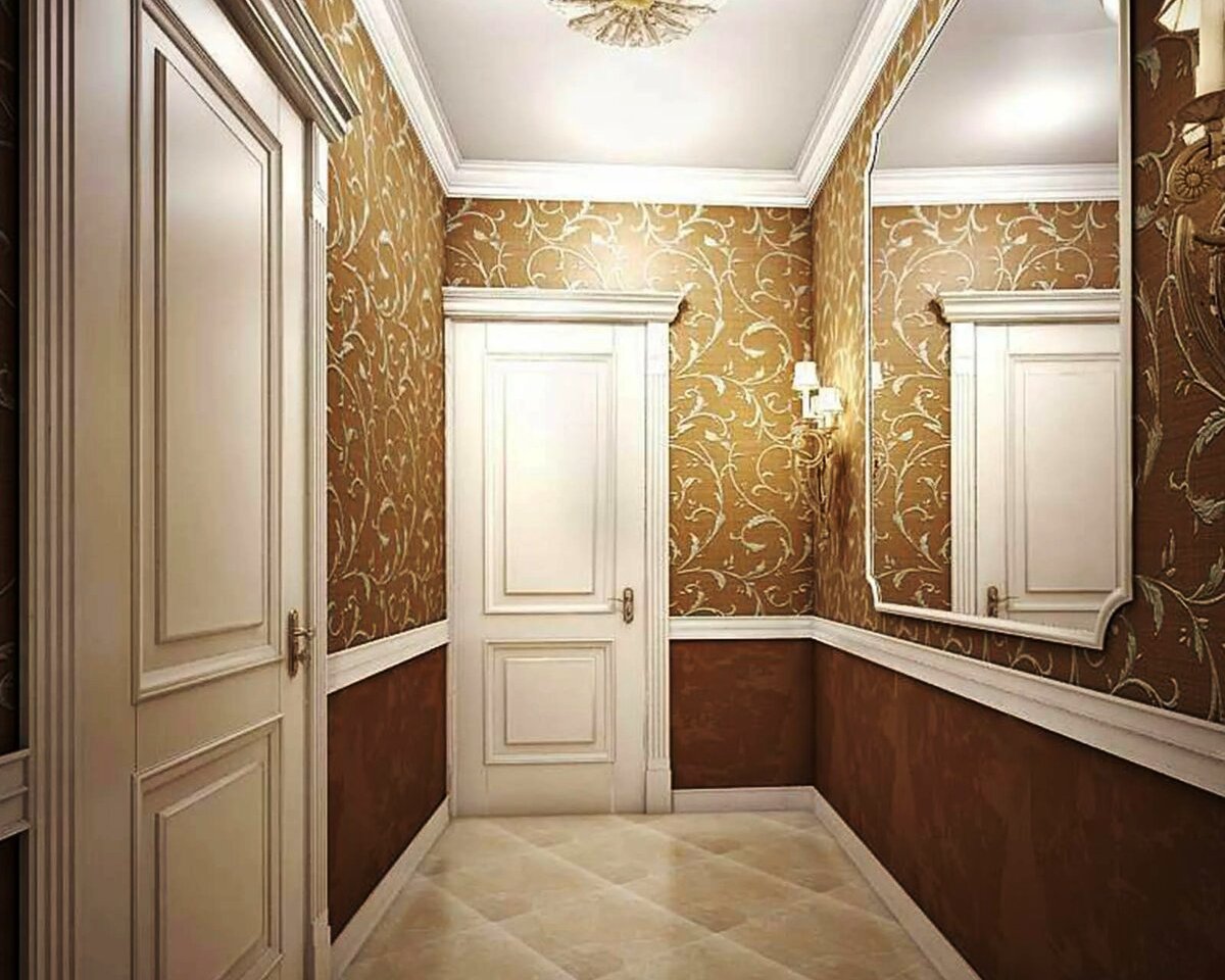 Неровности поверхностей поможет завуалировать разноцветное лоскутное комбинирование с однотонными полотнами или вкраплениями крупных изображений с завитками. Для просторной прихожей идеально сочетание простых ровных и текстурных полотен с имитацией разных материалов.