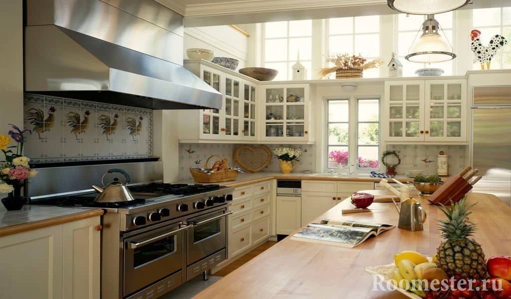 Дизайн подкрепляется витражами, панно и прочими элементами. Чтобы в большой кухне освободить место, сделать ещё более свободной, используйте трансформируемую мебель. Среди них: различные столы с откидывающимся верхом, увеличение рабочей зоны возле окна, обустройство оконного проёма полками. Функциональности добавят различные системы хранения продукции под потолком, столом или организованная ниша.