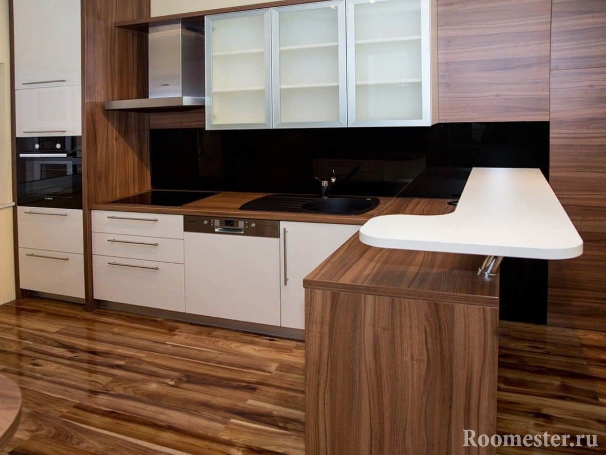 Лучше всего визуально разделить помещение на отдельные зоны — рабочую и обеденную. В рабочей зоне будет стоять гарнитур со встроенной бытовой техникой, обеденная зона может находиться в углу, либо у стены. Устанавливать стол в центре нельзя, так как он попросту затруднит перемещение по кухне.