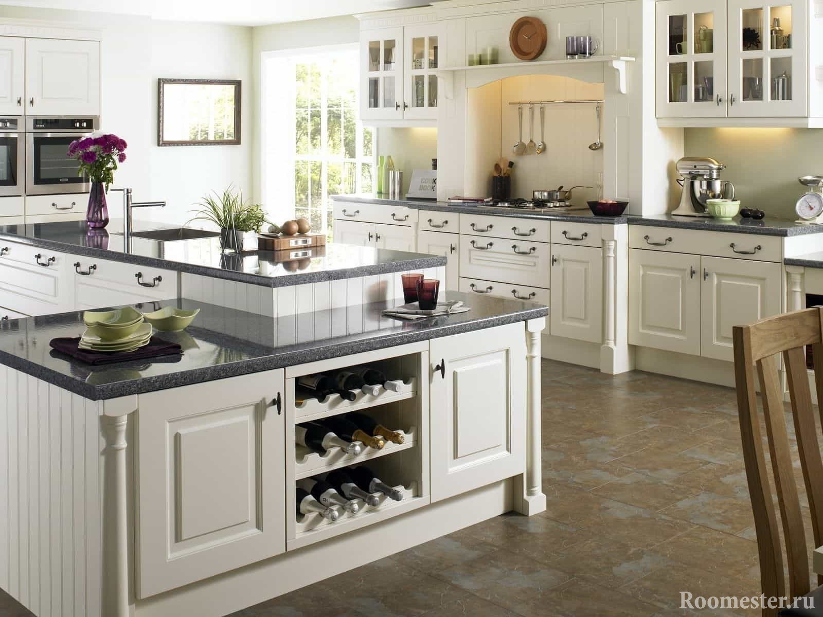 В дополнение к светлому гарнитуру обеденная зона, остров, барная стойка и другие детали нередко приобретаются из той же коллекции. Это особенно актуально для маленьких кухонь, а также интерьеров в классическом и деревенском стиле, где мебель достаточно богато декорируется резьбой, узорами, изысканной фурнитурой. В более демократичных вариантах дизайна можно экспериментировать, совмещая предметы из разных каталогов – главное, чтобы какая-то черта объединяла их в единую композицию. Такую роль может играть повторяющийся цвет, фактура, материал, формы или габариты.