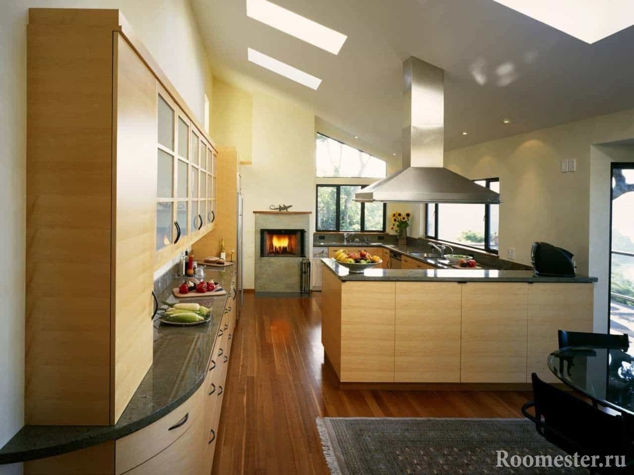 Свободное пространство в частном доме позволяет хозяевам экспериментировать с дизайном кухни. Тут главный акцент нужно ставить на планировку. Помещение делится на функциональные зоны, сюда отлично подойдет практически любой стиль интерьера. Особо отличаются проходные кухонные комнаты или объединенные с гостиной. Отгородить пространство кухоньки можно с помощью барной стойки, столешницы или другой мебели.