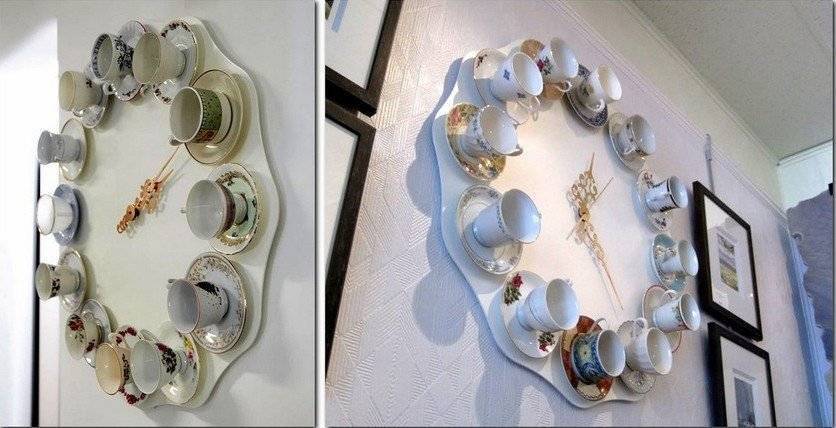Ярко и изящно украсить хронометр можно, используя сервиз чашек и блюдец. Они необязательно должны иметь одинаковое оформление. Самыми броскими станут изделия, созданные с использованием разных по виду и расцветкам чашек и тарелочек. Изготовить модель довольно легко. Работа займет не более 1 часа и проводится она по такой инструкции: