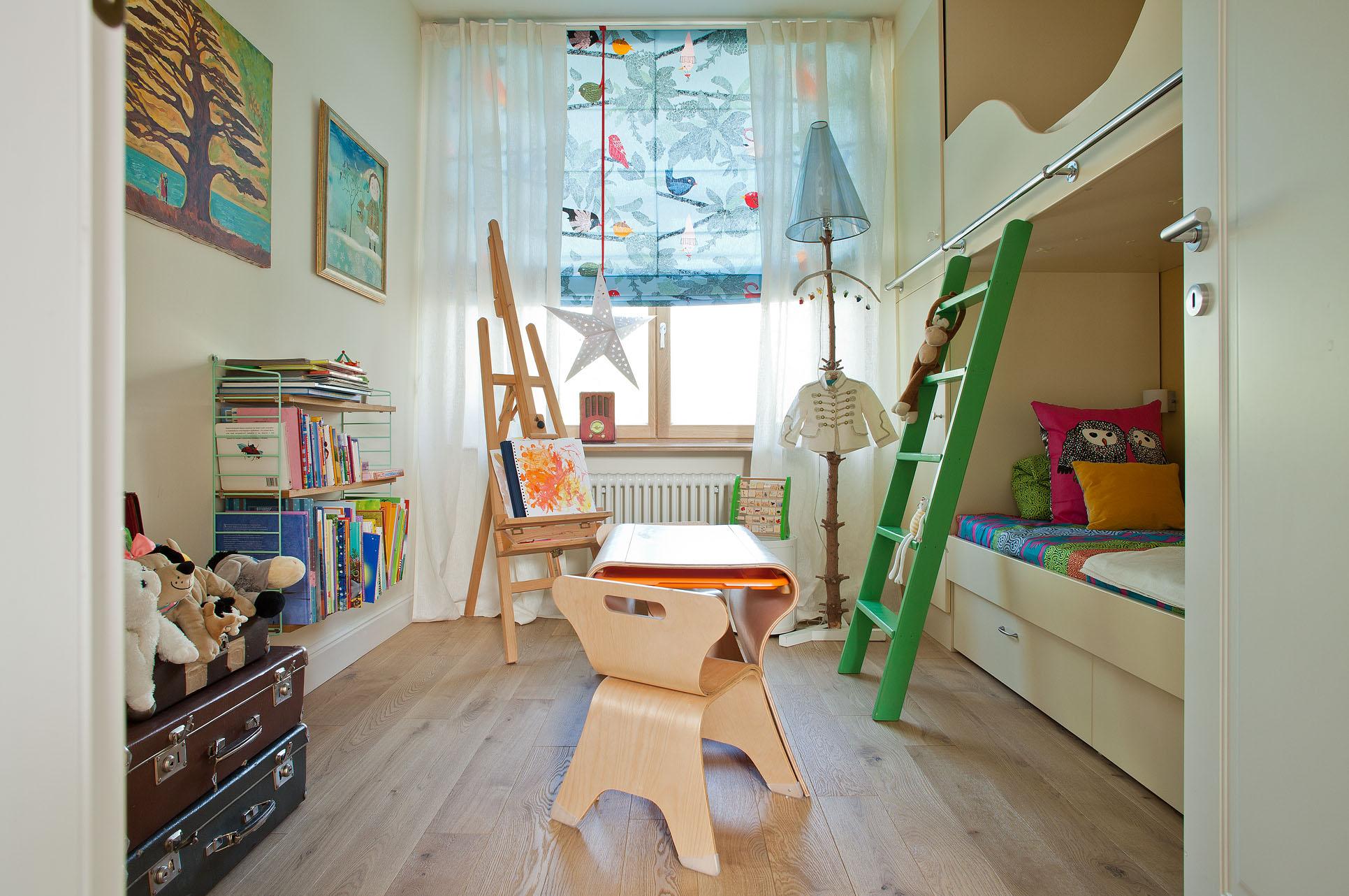 Чтобы не усложнять, остаётся только полностью нейтральный цвет мебели — белый. Белый идеально сочетается с любыми даже яркими цветами, он в моде, он выглядит стильно. Цвет ламината на полу тоже желательно выбирать с низкой насыщенностью(т.е. без явного ухода в оттенки). Крутой пример детской для двух детей 13 метров квадратных с мебелью белого цвета: