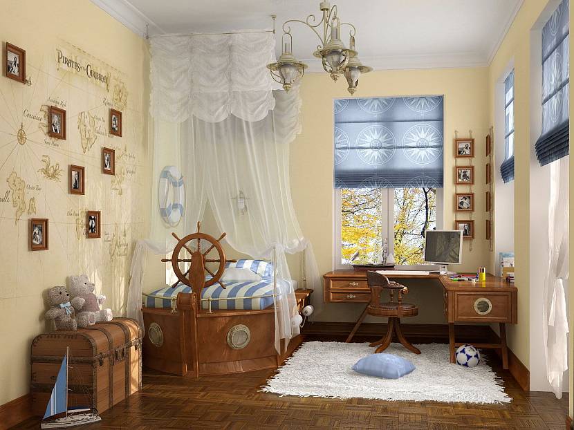 Детская 10 м2, дизайн которой выбран в морской тематике может быть оформлена и для мальчиков, и для девочек любого возраста. Мебель в этом случае подбирается из натуральной древесины, стены оформляются штукатуркой или обоями, фотообоями морской тематики. Текстиль должен имитировать паруса, а аквариумы и картины с изображениями моря дополнят общий дизайнерский стиль.