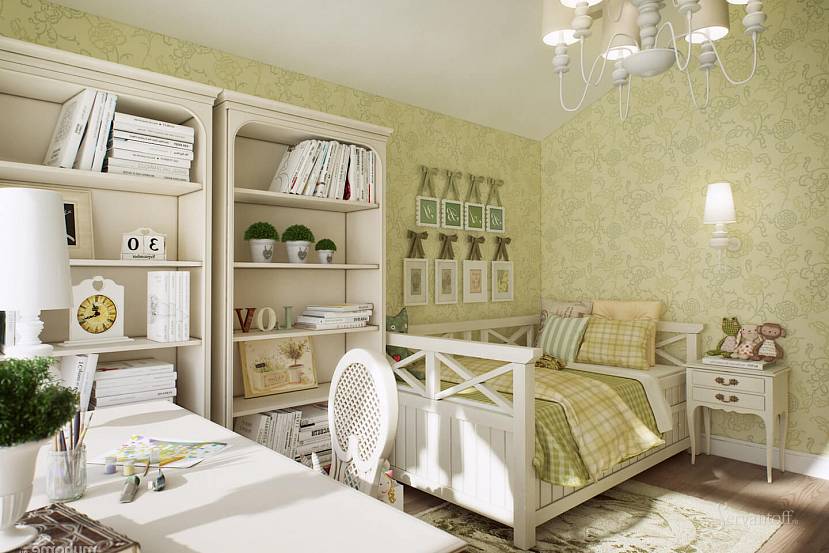 Для маленькой детской комнаты идеальным является стиль прованс. Он оформляется при помощи винтажной или искусственно состаренной мебели с резьбой и росписью. К месту будут кресло-качалка, комод и тумбочки. Обои с цветочными и деревенскими мотивами допускаются цвета охры, сиреневые, голубые, розовые. Шторы – римские, с ламбрекенами, аксессуарами станут рюши, кружева, банты и вышивка.