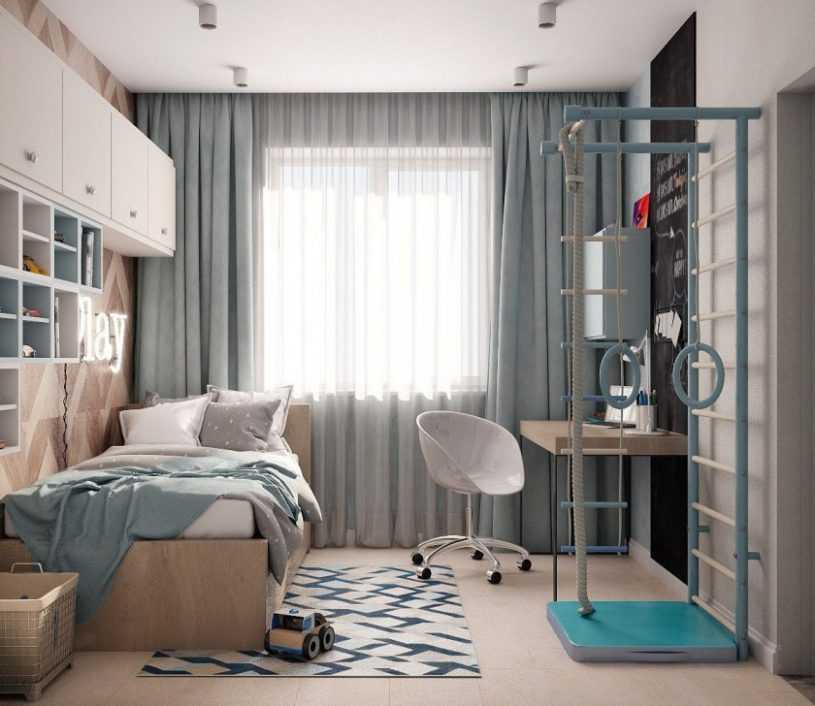 Если в комнате есть хотя бы 1 м² свободной площади, обязательно нужно обустроить спортивный уголок. Для такого возраста это может быть небольшой многофункциональный тренажер. В углу следует разместить боксерскую грушу, а в дверном проёме закрепить турник. Так подросток сможет отдыхать между выполнением уроков. Кроме того, спортивное оборудование принесет большую пользу в переходном возрасте, когда идёт всплеск гормонов.