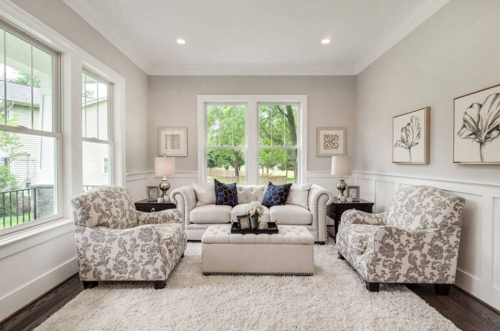 Белая. Помещение характеризуется огромным простором и невесомостью. Если в комнате стены оформлены белоснежным цветом, то мебель можно установить любого оттенка. Чтобы атмосфера в гостиной заиграла живыми красками, рекомендуется в интерьер добавить предметы шоколадного или коричневого цвета. Очень красиво выглядит белый с графитовым тоном.