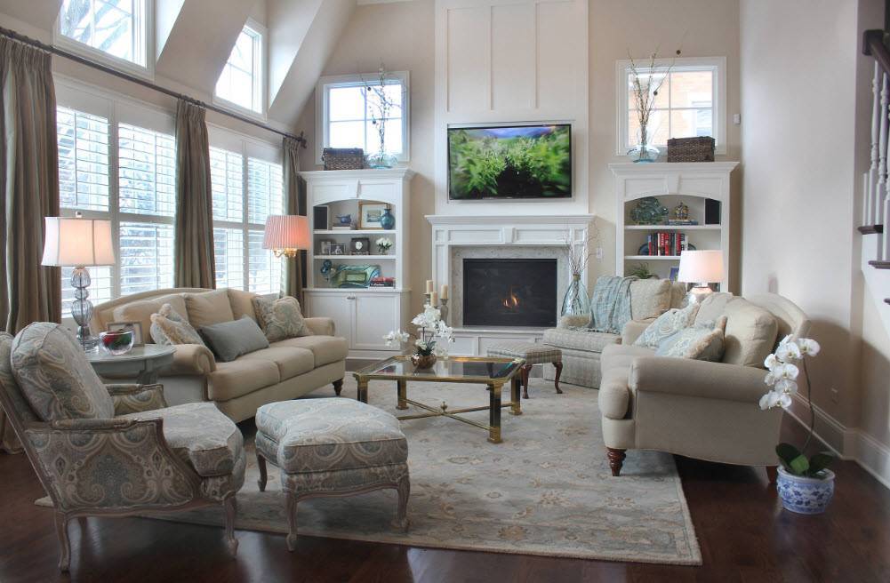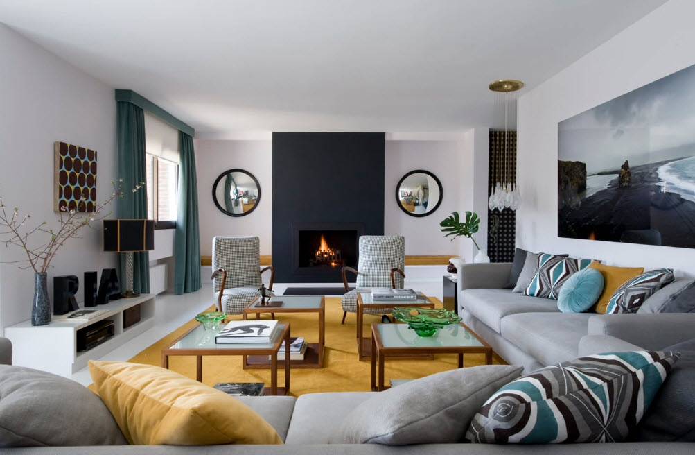 В зоне для просмотра телевизора обычно размещается большой телевизор на стене или тумбе, большой угловой диван либо же диван и несколько кресел и небольшой столик. В этой зоне можно отдохнуть с друзьями, попить чая и посмотреть телевизор. Каминная зона куда более серьезная и одновременно спокойная и предполагает наличие столика и нескольких кресел вокруг него. Вся атмосфера создает ощущение спокойствия и умиротворенности и позволяет провести беседу с товарищами, почитать газету, побеседовать с коллегой.