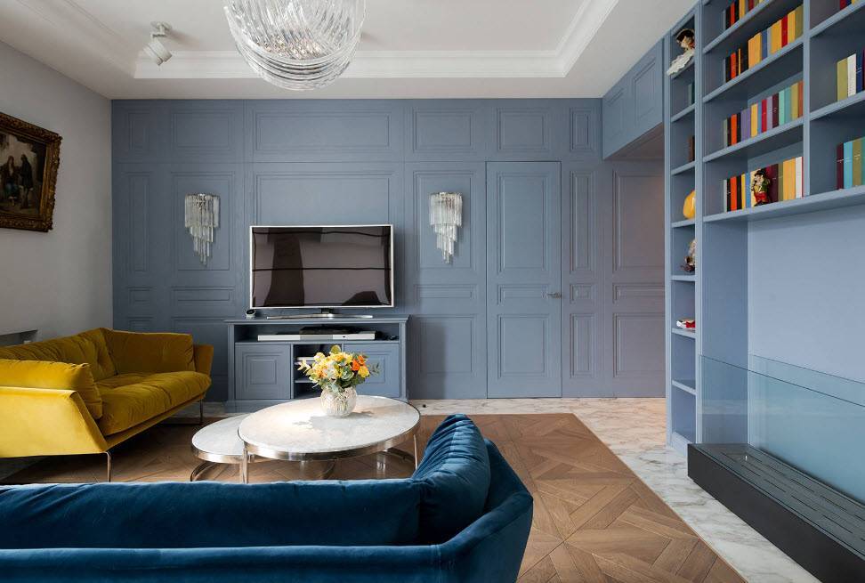 Синяя. Если гостиная имеет правильную форму и высокие потолки, то для ее отделки можно использовать модный синий цвет. При этом рекомендуется выбирать как светлые, так и насыщенные темные оттенки, например, индиго. Синий относят к холодной палитре, поэтому его в дизайне нужно обязательно разбавлять светлыми и теплыми тонами. Для этого хорошо подойдет серый и бежевый.