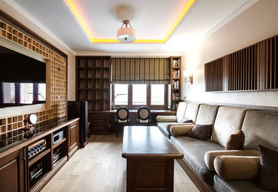 Окно в такой гостиной используют как полноценное рабочее место. Портьеры «в пол» убирают, вместо них устанавливают рулонные шторы, жалюзи. Загромождать зону подоконника нельзя – это нарушит инсоляцию. Проблему решают установкой стеллажей рядом с оконным проемом – тут удобно размещают книги, учебные и игровые принадлежности.