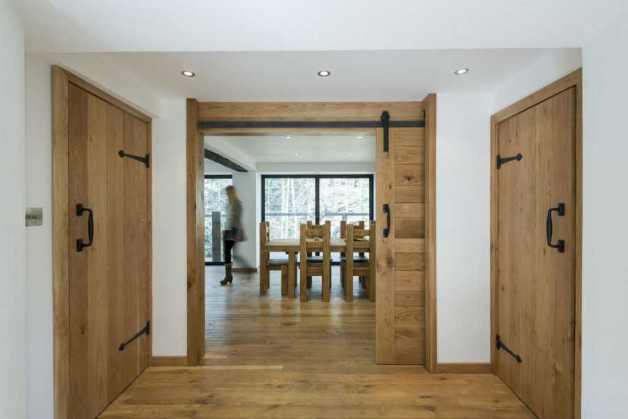 Распашные двустворчатые двери с тяжелыми металлическими накладками и ручками украсят деревенский дом. Для экономии места и более современного стиля можно выбрать раздвижные конструкции. Такие двери можно установить во всех помещениях дома — в гостиной, спальне, кладовых и хозяйственных помещениях.