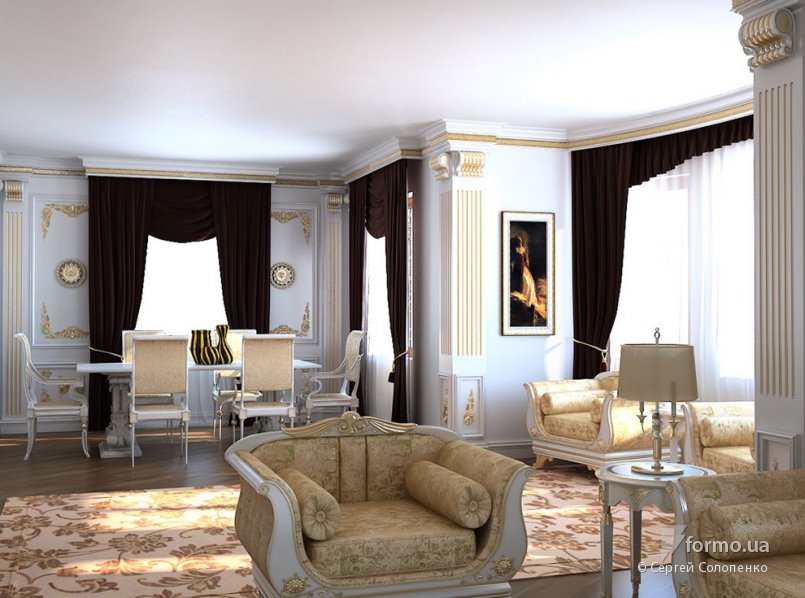 - столовую с большим удобным столом, где может комфортно разместиться большая семья и гости;