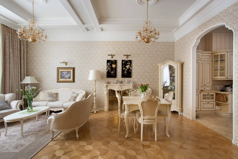 В прошлом, да и сейчас тоже, паркет является одним из самых дорогих видов напольного покрытияНапольная плитка – вариант для больших гостиных. Настоящая дворцовая зала