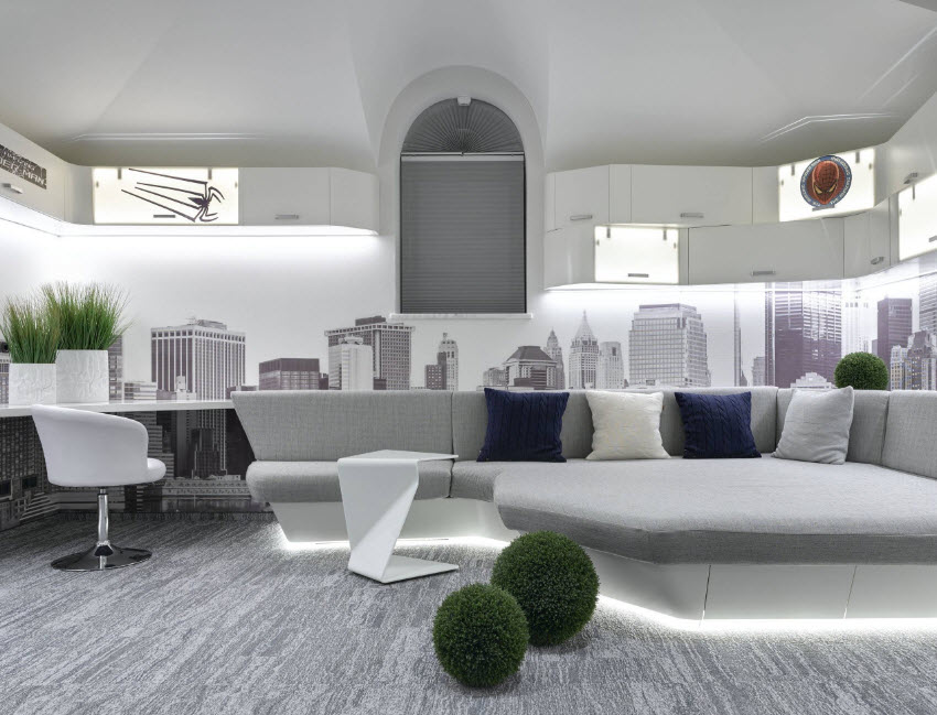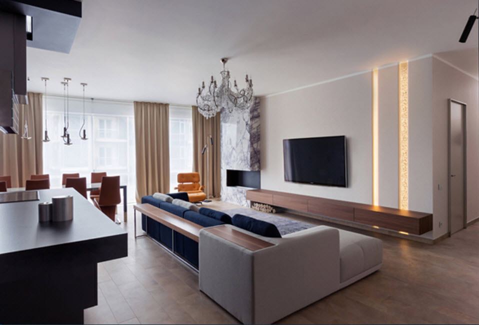 Сегодня очень широкое применение получили различные светодиодные подсветки. Такой технологический и инновационный свет на человека оказывает интересные впечатления своеобразного футуризма, что очень уместно, если вы хотите получить стильный дизайн гостиной 2021.