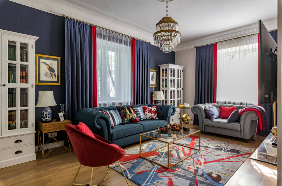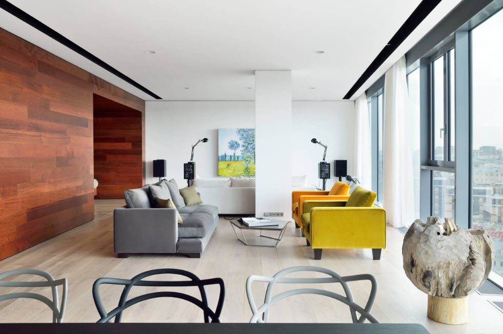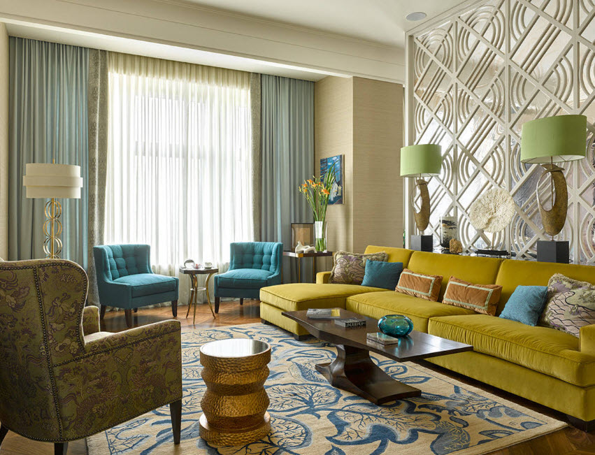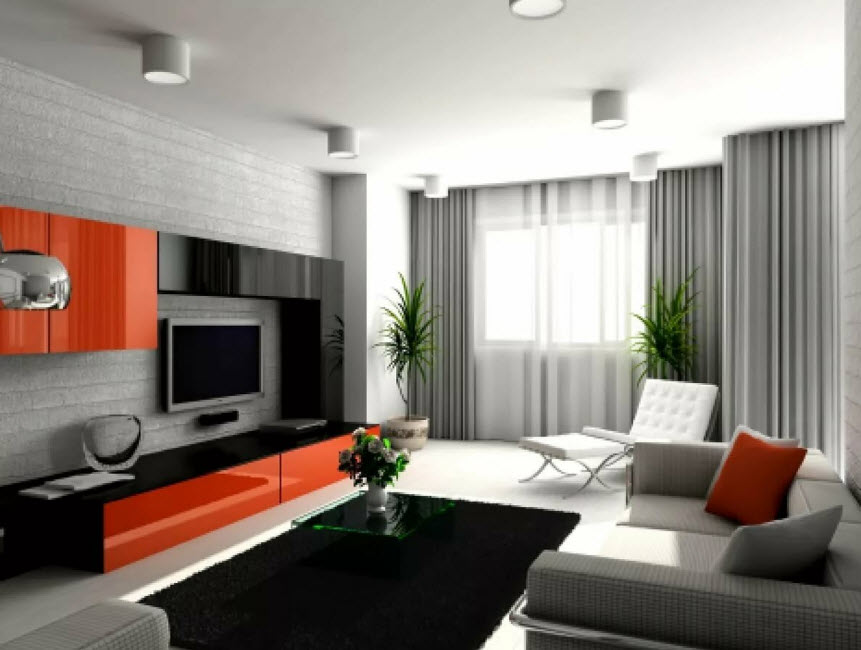Яркие гостиные уместны в стиле минимализм, фьюжн, китч, лофт. Если говорить о чувстве меры и элегантности, то стоит выбирать более сдержанную гамму, а броские тона использовать только в акцентных деталях. Впрочем, у каждого свое понятие «яркости», а стремление к индивидуальности позволяет окрашивать интерьер гостиной в частном доме или же в квартире абсолютно в любой цвет.