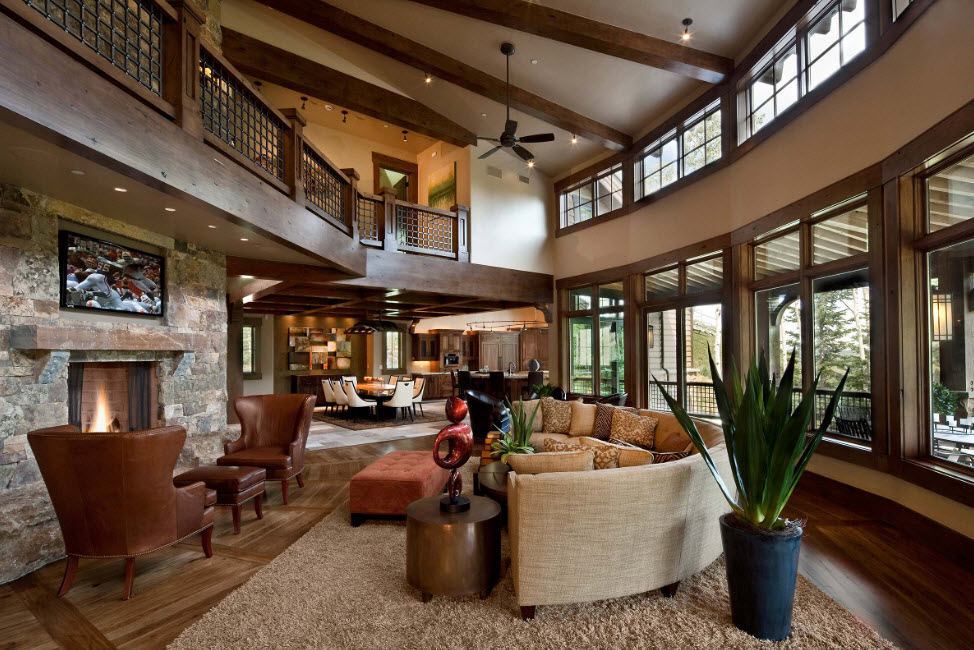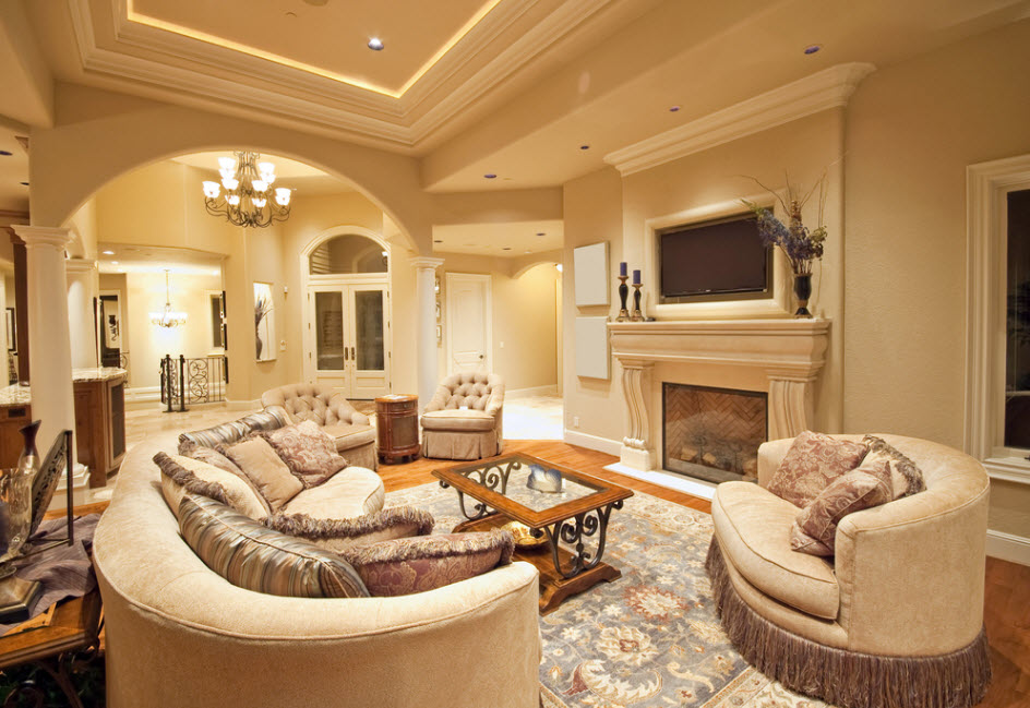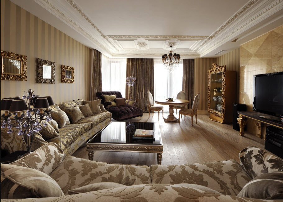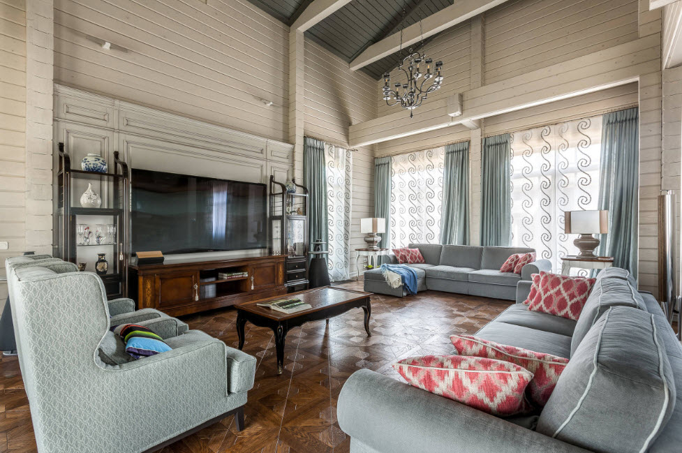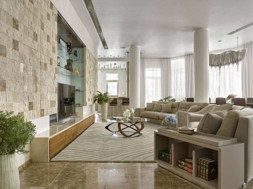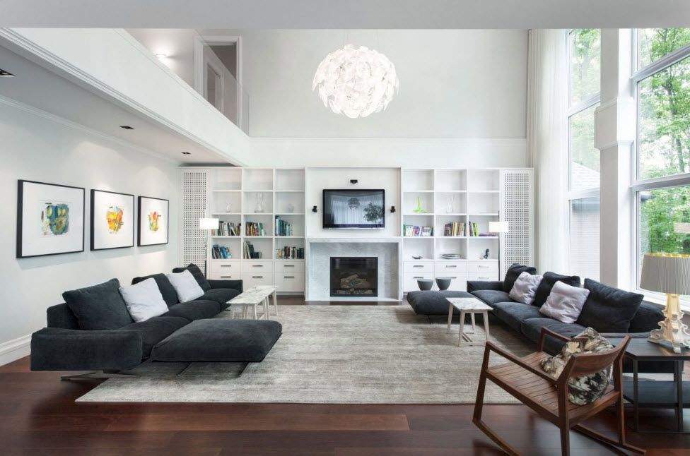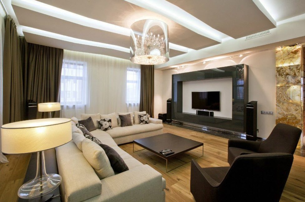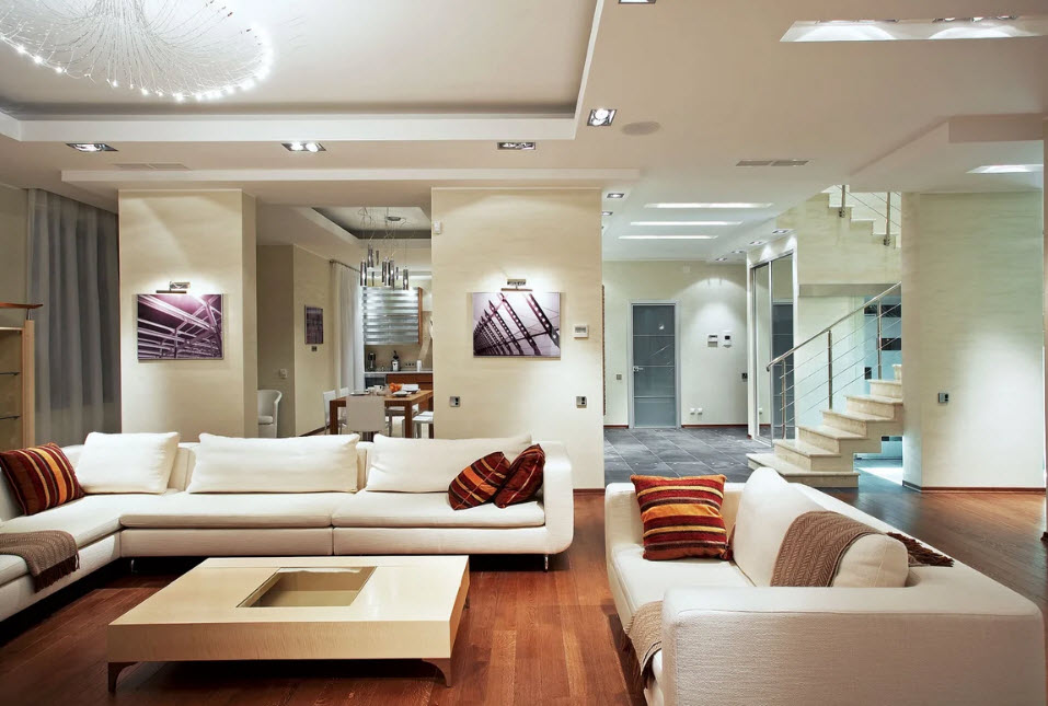 Конкретный способ обустройства интерьера большой гостиной определит хозяин самостоятельно. Но популярностью пользуются такие варианты: