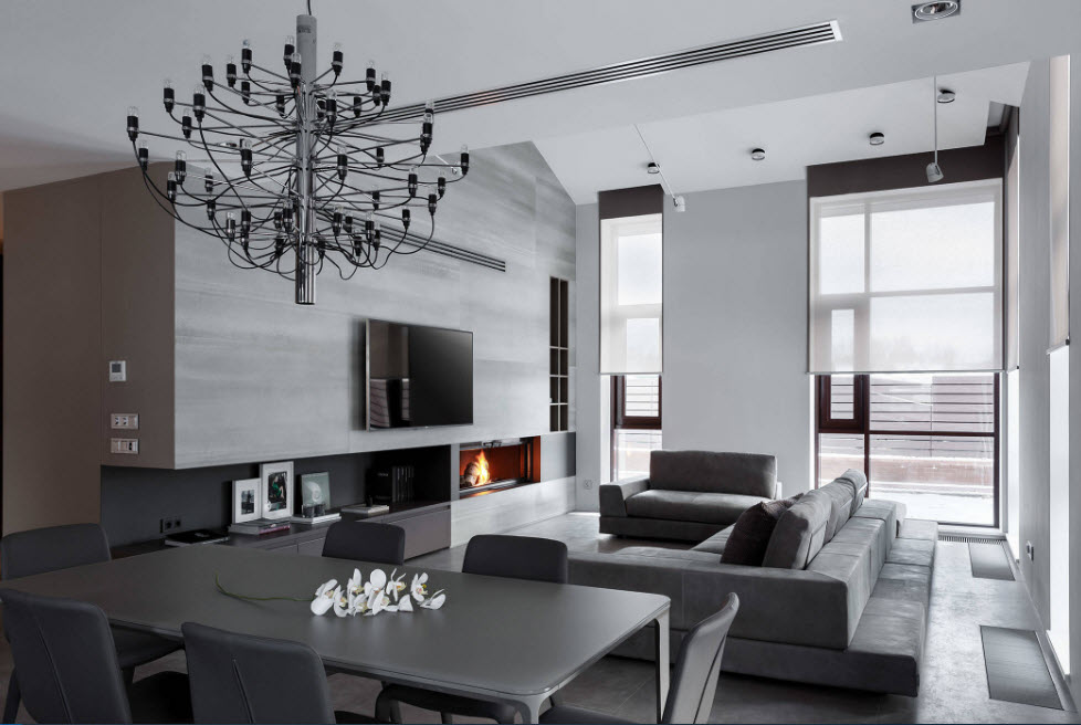 В современных интерьерах большое значение имеет умелое использование пространства и широкая функциональность используемых решений. Современный зал характеризуется господством минималистских тенденций и уважением к эстетическим принципам.