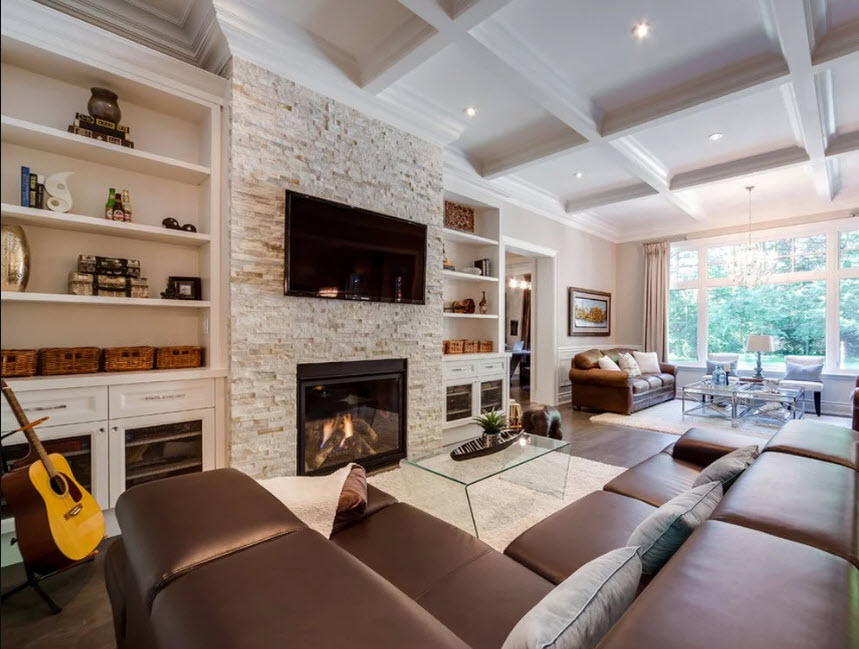 Для некоторых стилей интерьера используются кирпичная и каменная кладка (например, Лофт). Выгодным дизайном обладает гостиная, выполненная в стиле охотничьего домика, где стены и потолочные перекрытия выполнены из деревянных срубов.