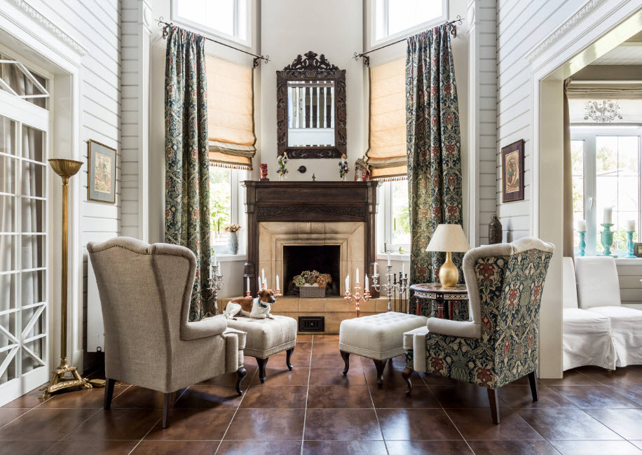 Меблировать зал можно разными предметами, сочетая между собой «старые бабушкины кресла» и современные аксессуары. Акцент делается на просторный диван, желательно бывалой старины. Декорировать такую гостиную можно: