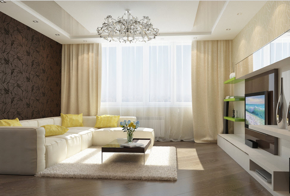 Современные тенденции практически не коснулись зонирования: по-прежнему в моде арки в гостиной, стеллажи, легкие перегородки, шторы, трансформируемые решения, светильники и многоуровневые конструкции. Меняется лишь дизайн таковых. Если в классическом интерьере гардины будут с драпировками и ламбрекенами, то в современном зале это будут простые ниспадающие полотна на металлическом или потолочном пластиковом карнизе.