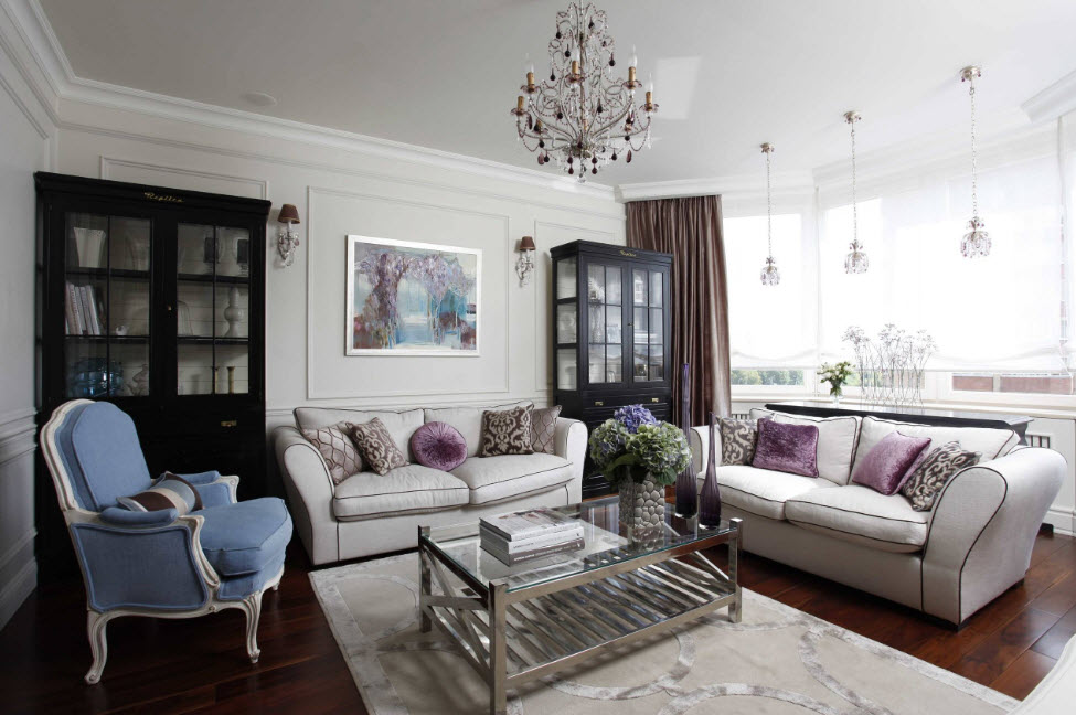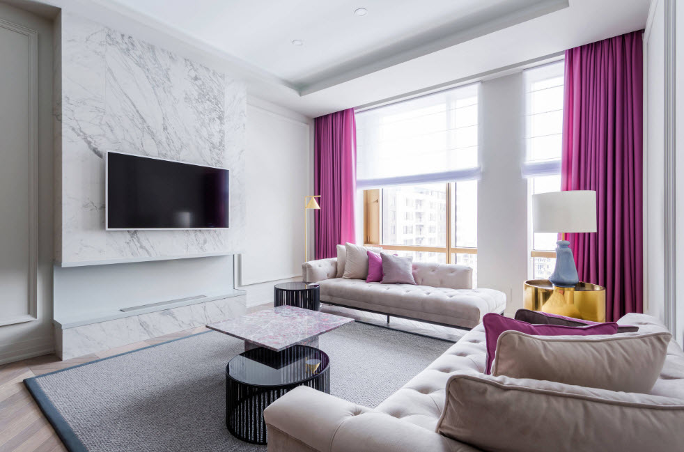 Но все-таки лучше сочетать светлые оттенки с более яркими деталями. Например, интерьер гостиной с белой мебелью хорошо смотрится с контрастным текстилем. Подойдут такие тона: