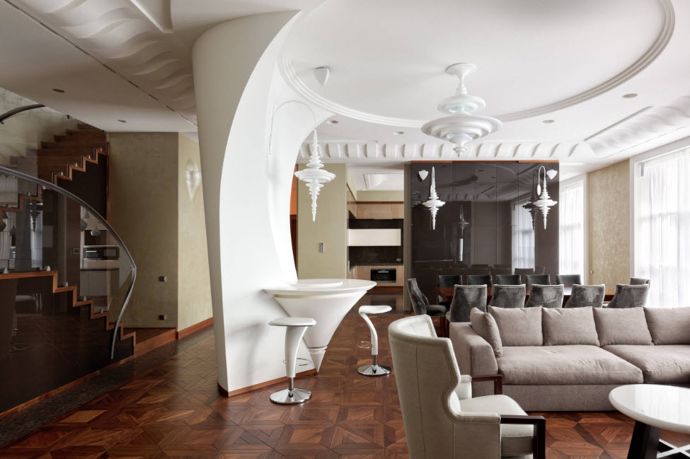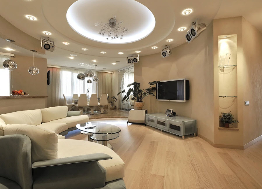 Чаще всего используются подвесной, натяжной, крашеный и двухуровневый гипсокартоновый потолки. Разглядывая фото дизайнов гостиных можно сделать вывод, что наиболее мягкими и нейтральными будут белые и светлые потолки (в интерьере жилья отражается внутреннее состояние владельца).