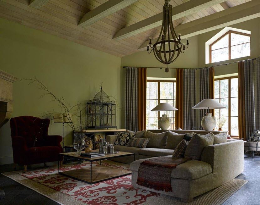 Стены гостиной можно выложить кирпичом либо оклеить соответствующими по рисунку обоями. Потолок и полы рекомендуется застелить досками либо однотонной плитой. На окнах следует размещать жалюзи. Цветовое решение комнаты может быть самым разнообразным, но чаще всего выбирают: