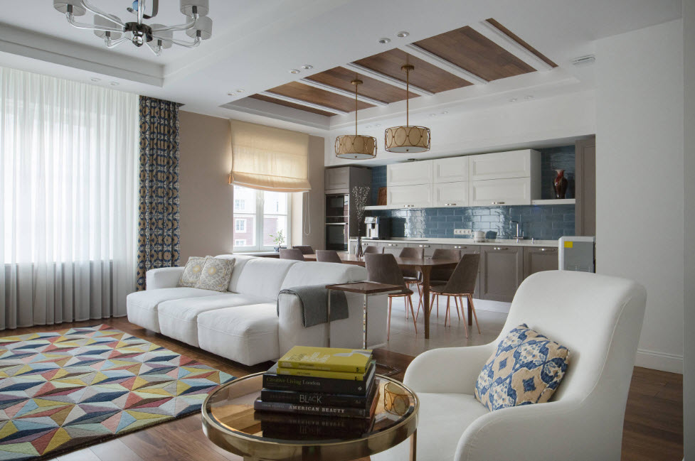Если, например, гостиная соединена с кухней, и ее площадь больше 14 метров, рекомендуется дважды акцентировать внимание и на гостиной, и на кухне.