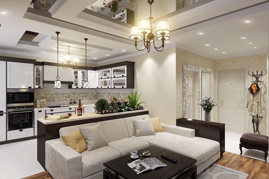 Обставляя небольшую гостиную с кухней 20 кв. м, постарайтесь максимально визуально увеличить пространство. Используйте светлые цвета, которые не только помогут вам почувствовать, что интерьер более просторен и чист.