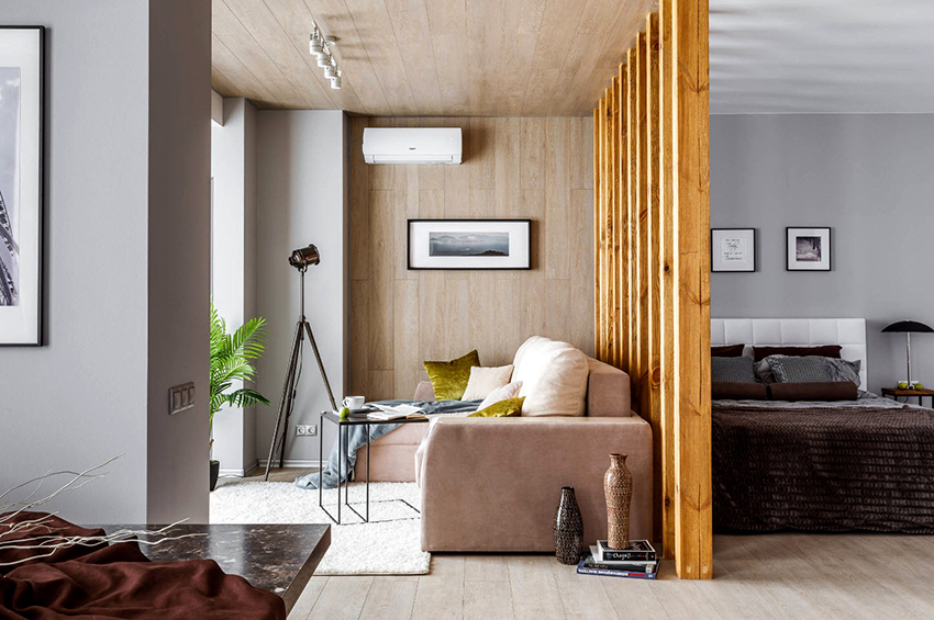 Фото зонирования спальни-гостиной на 16 квадратных метрах с помощью перегородок: