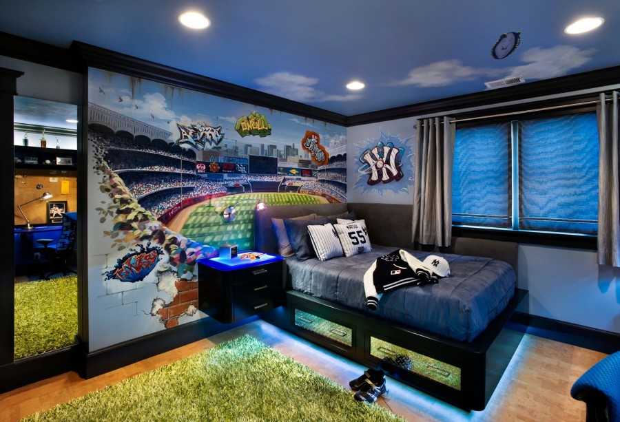Для подростков, которые занимаются спортом, прекрасным решением является оформление комнаты в спортивном стиле. Здесь в декоре вполне уместными будут яркие краски, игра контрастов. Стены могут быть оформлены в спокойных тонах, а декор уже выбирается в зависимости от вида спорта. В игровой зоне можно поместить баскетбольную сетку или боксерскую грушу. Стены можно оклеить тематическими наклейками.