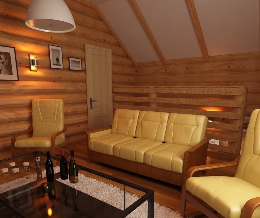 Вся внутренняя отделка комнаты будет зависеть от вкусовых предпочтений хозяев и их финансовых возможностей. Возможна обшивка стен блок-хаусом со специальной тонировкой. При наличии просторного помещения и хорошей системы отопления и вентиляции можно поклеить обои. При желании возможно обшить стены гипсокартоном или ГВЛ.