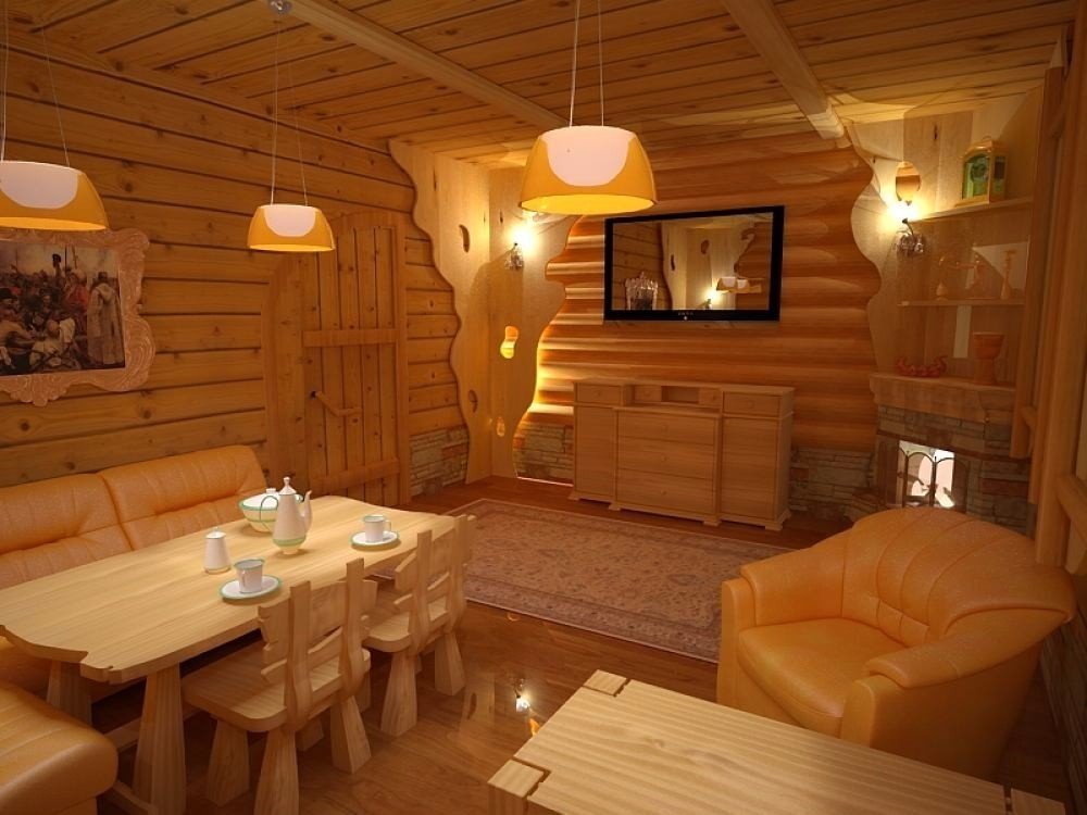 При оформлении интерьера комнаты отдыха в бане соблюдают несколько определенных условий и правил. Так, для создания красивого дизайна используют отделочные материалы, которые не содержат металлических деталей и являются влагостойкими.