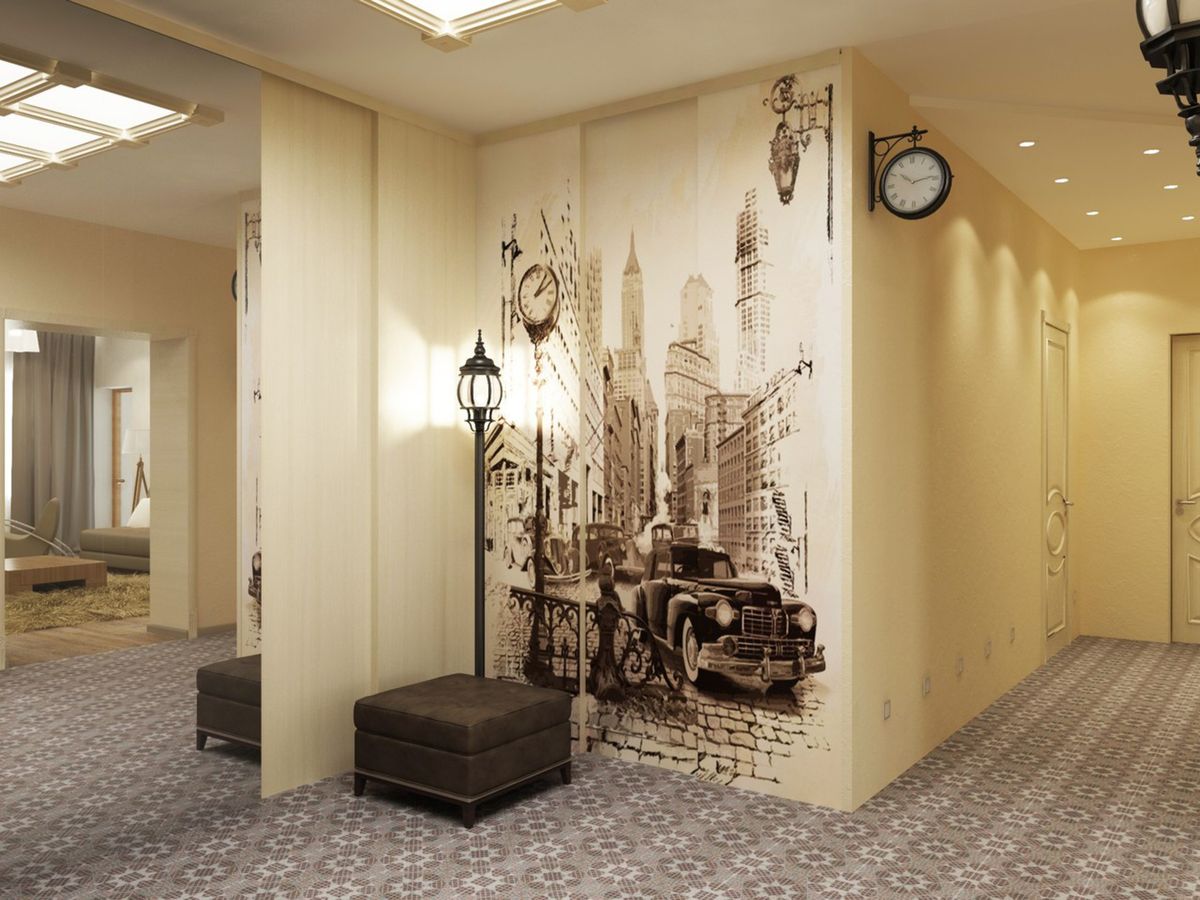 Мебель и отделка может быть выдержана в бежево-коричных цветах, которые удачно подойдут под любой стиль. За счет использования холодных и светлых оттенков можно визуально увеличить коридор. Если в качестве отделки используются обои, то лучше выбирать однотонные варианты (допускается наличие мелких узоров).
