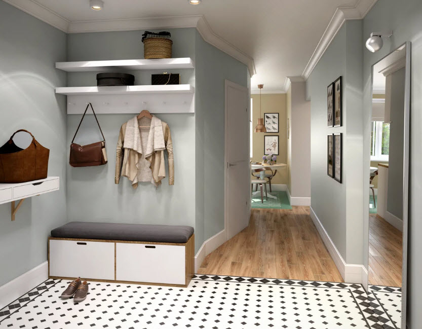 Если места очень мало, откажитесь от шкафа и приобретите вешалку. Нескольких крючков на стене будет достаточно. К числу вещей первой необходимости в коридоре также относится обувница. Её можно поместить под вешалку. Для экономии площади тумбу под обувь уместно совместить со скамьёй.